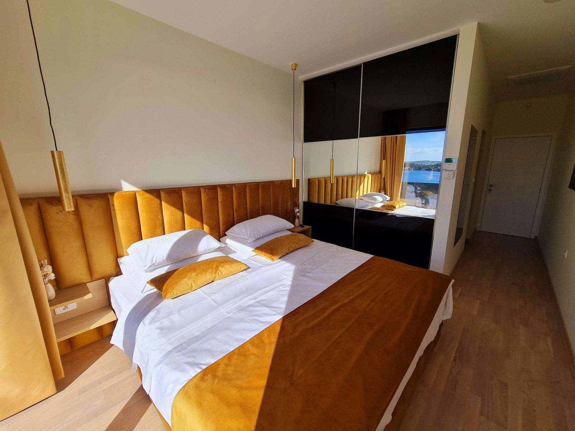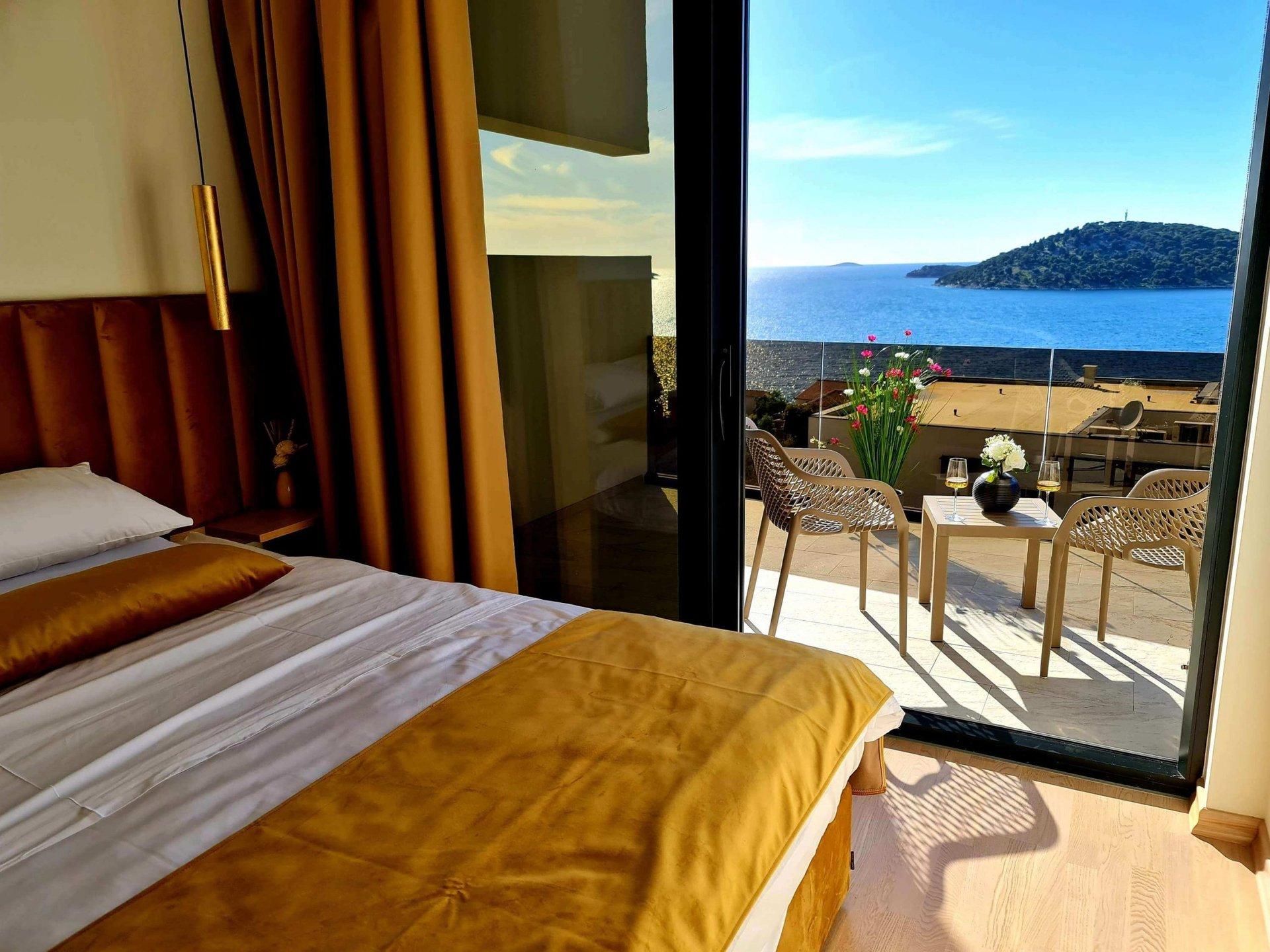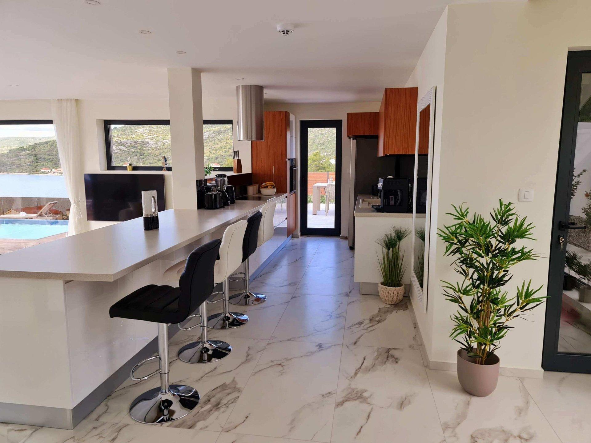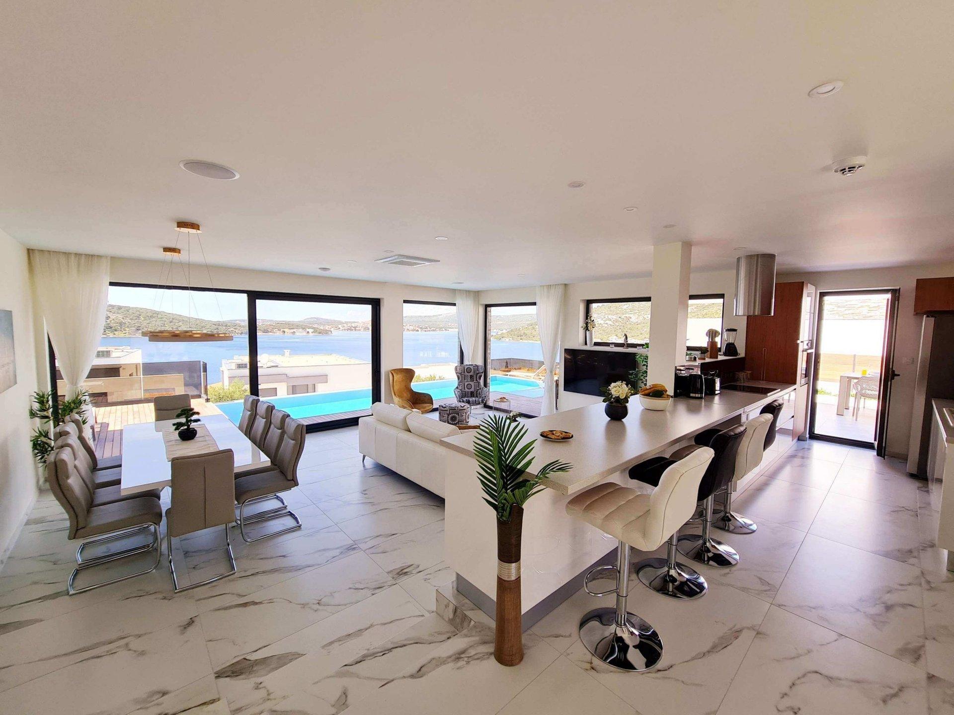 Vnitřní schodiště vede do prvního patra, kde se nacházejí čtyři ložnice s vlastní koupelnou a krásným výhledem na moře a ostrovy.