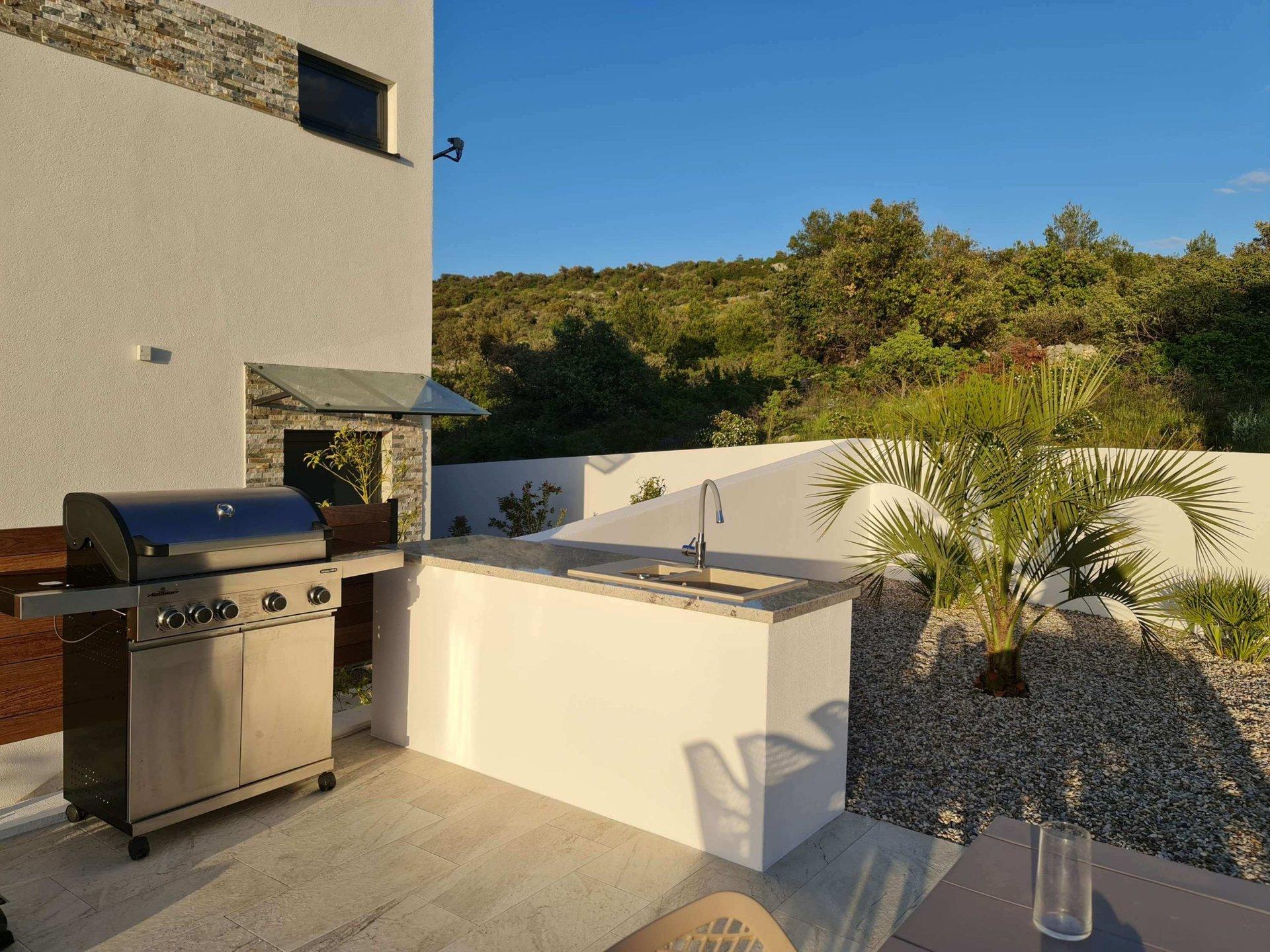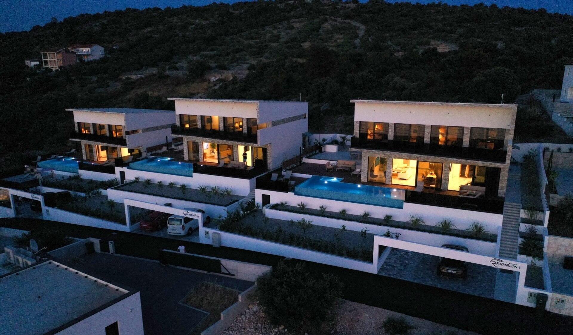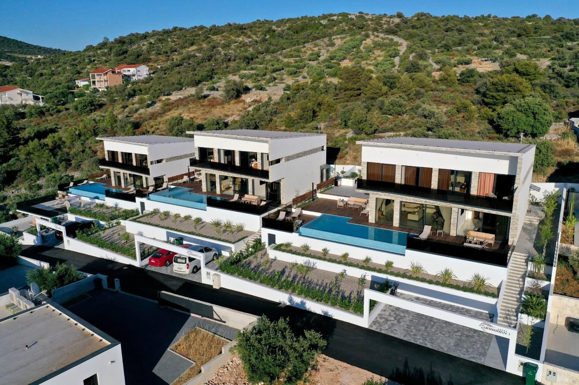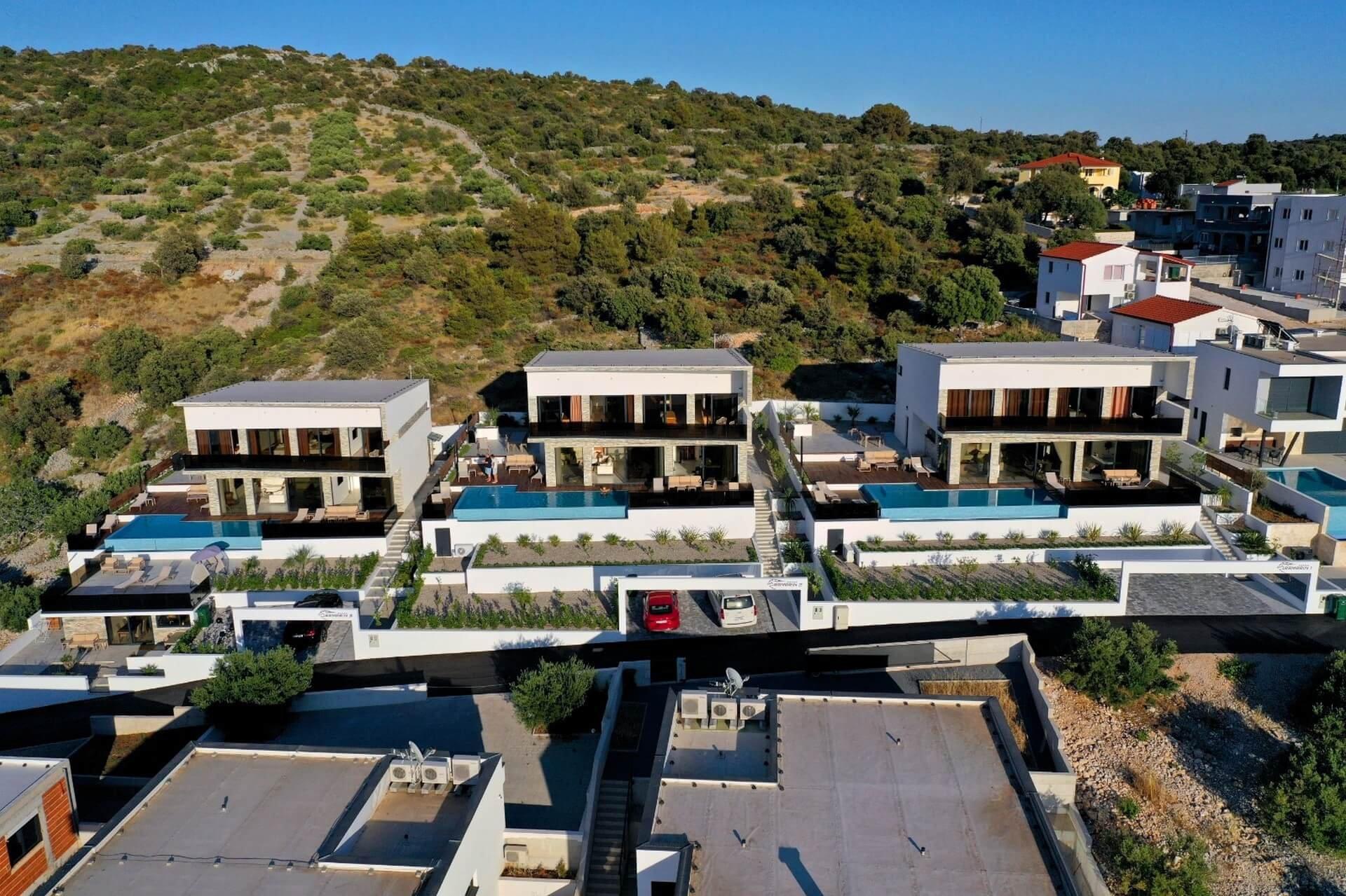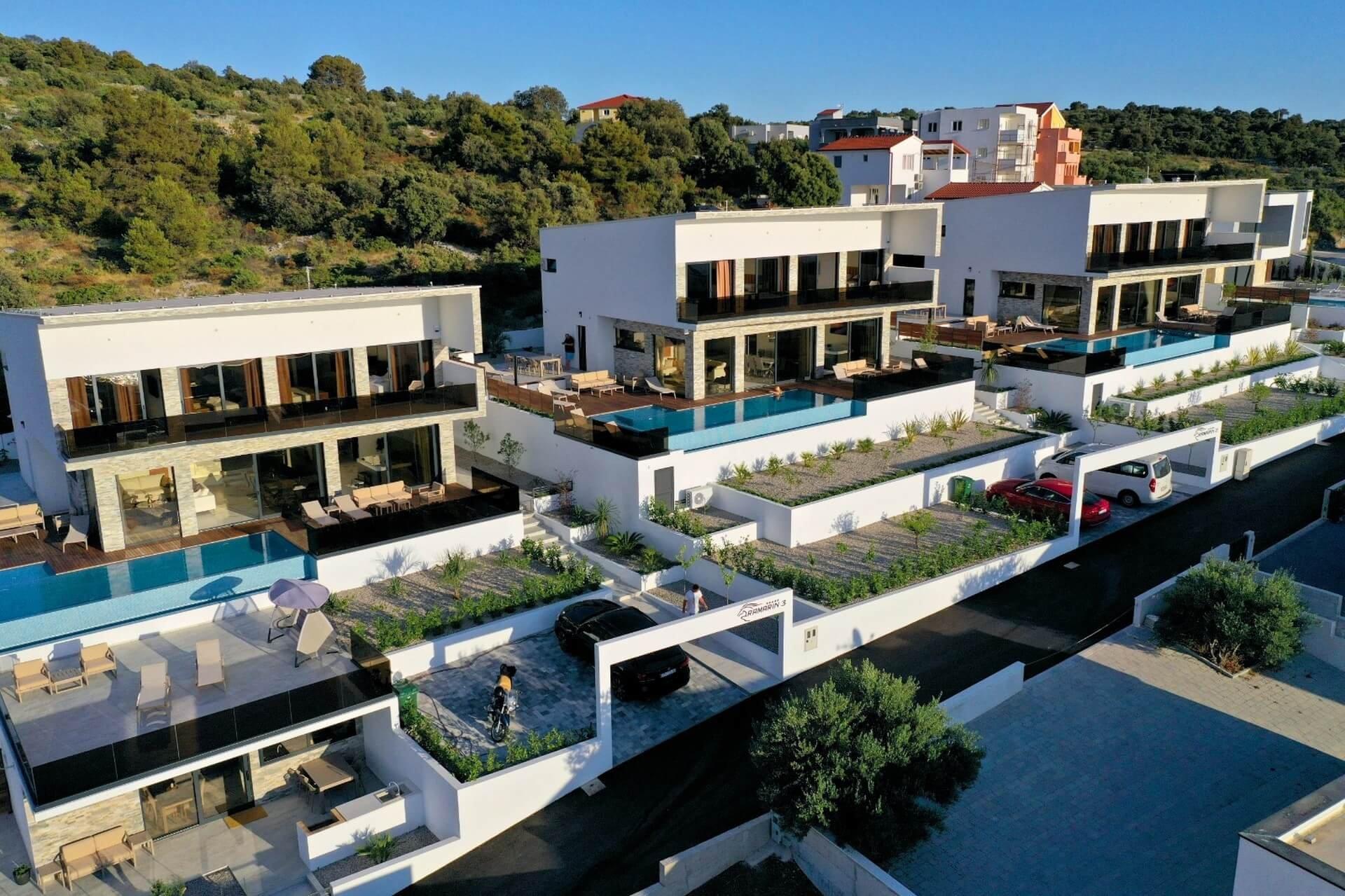 Uvnitř oploceného dvora se nachází zahrada obohacená středomořskými rostlinami a parkoviště pro tři auta. Vila se vyznačuje moderním exteriérem a čistými liniemi, a zároveň maximální funkčností a komfortem prostoru.
