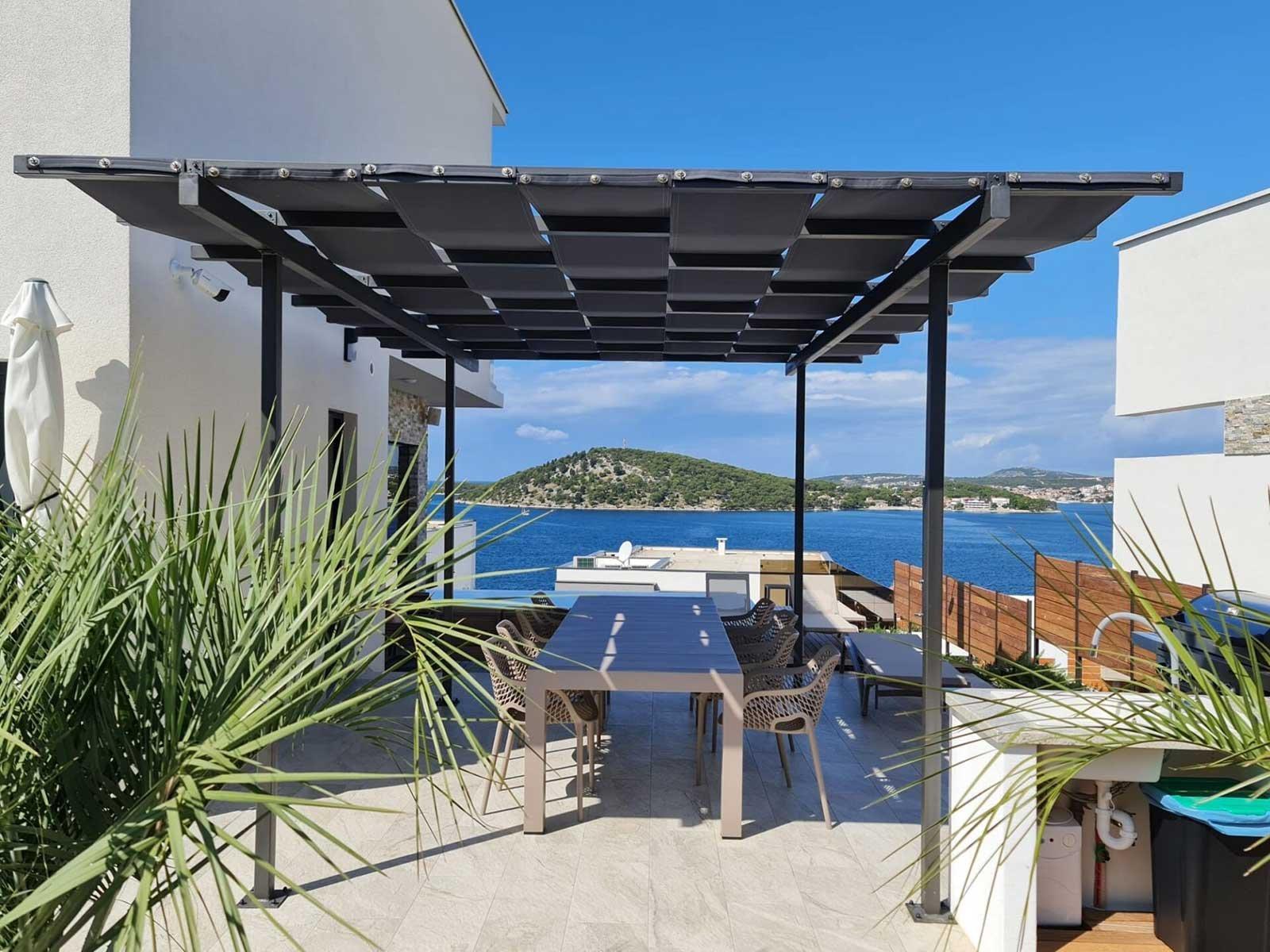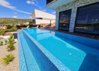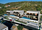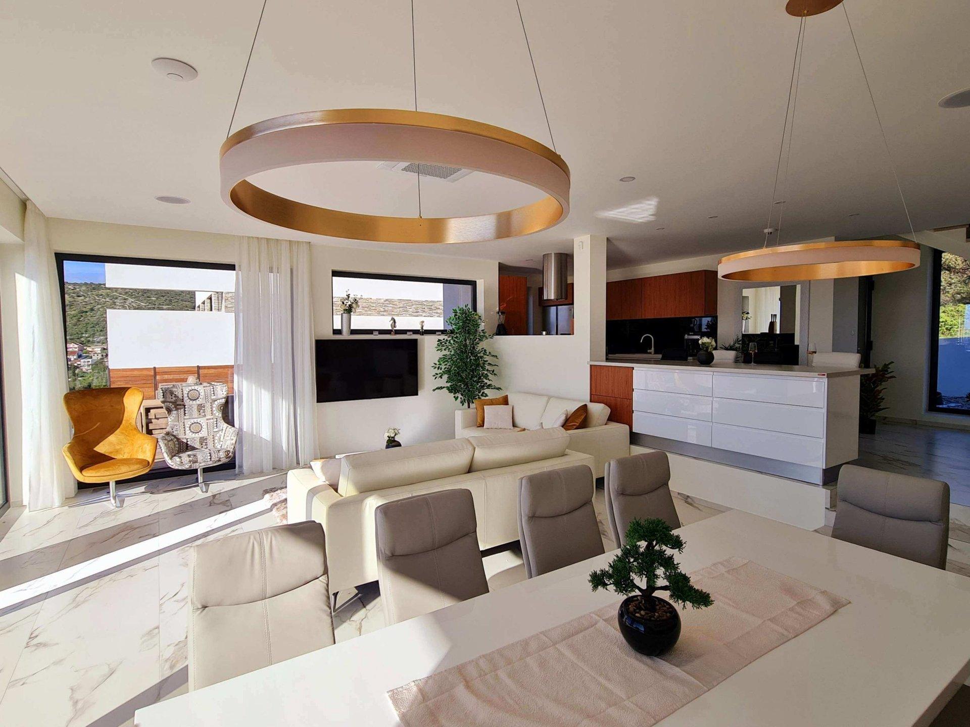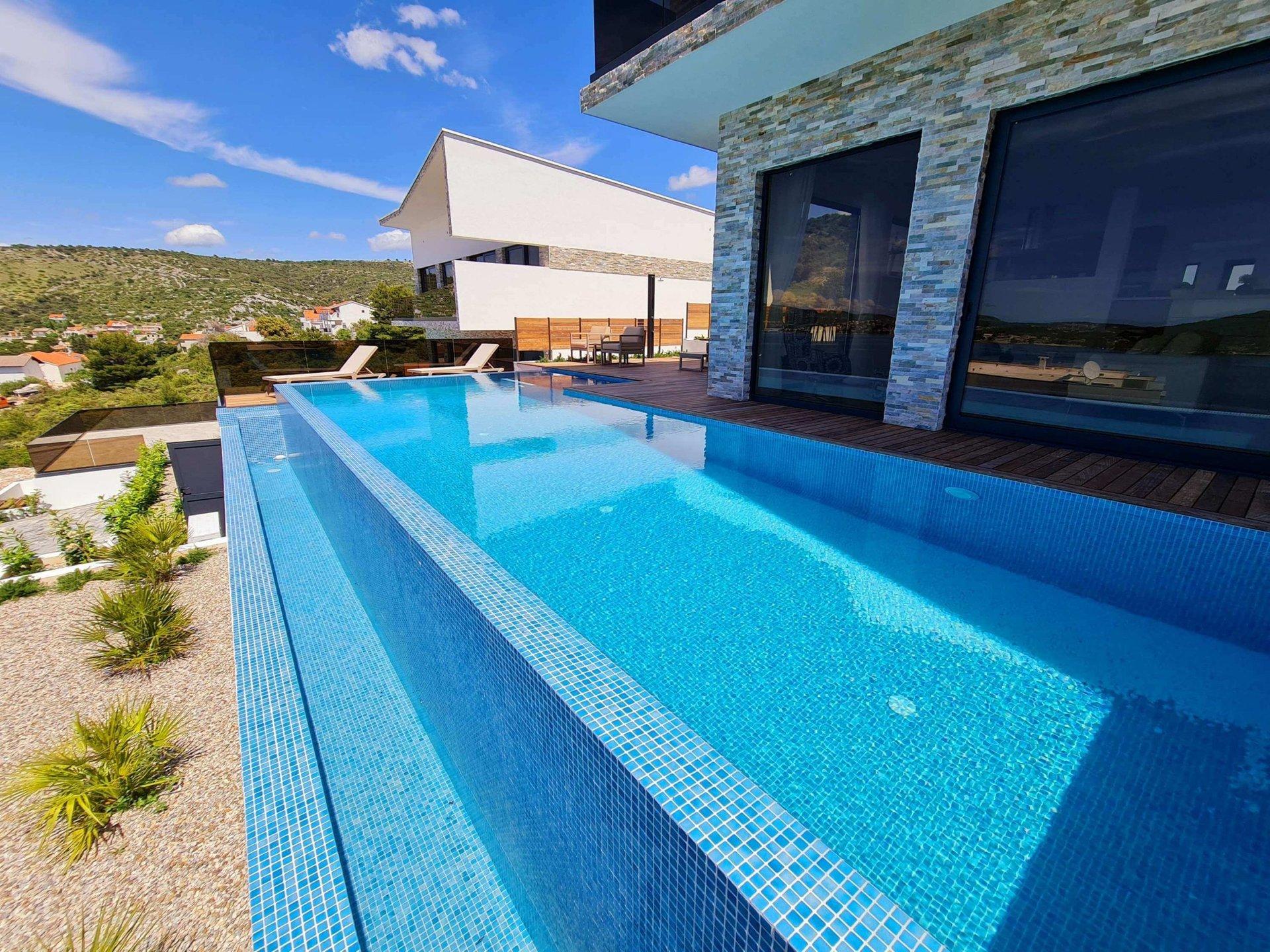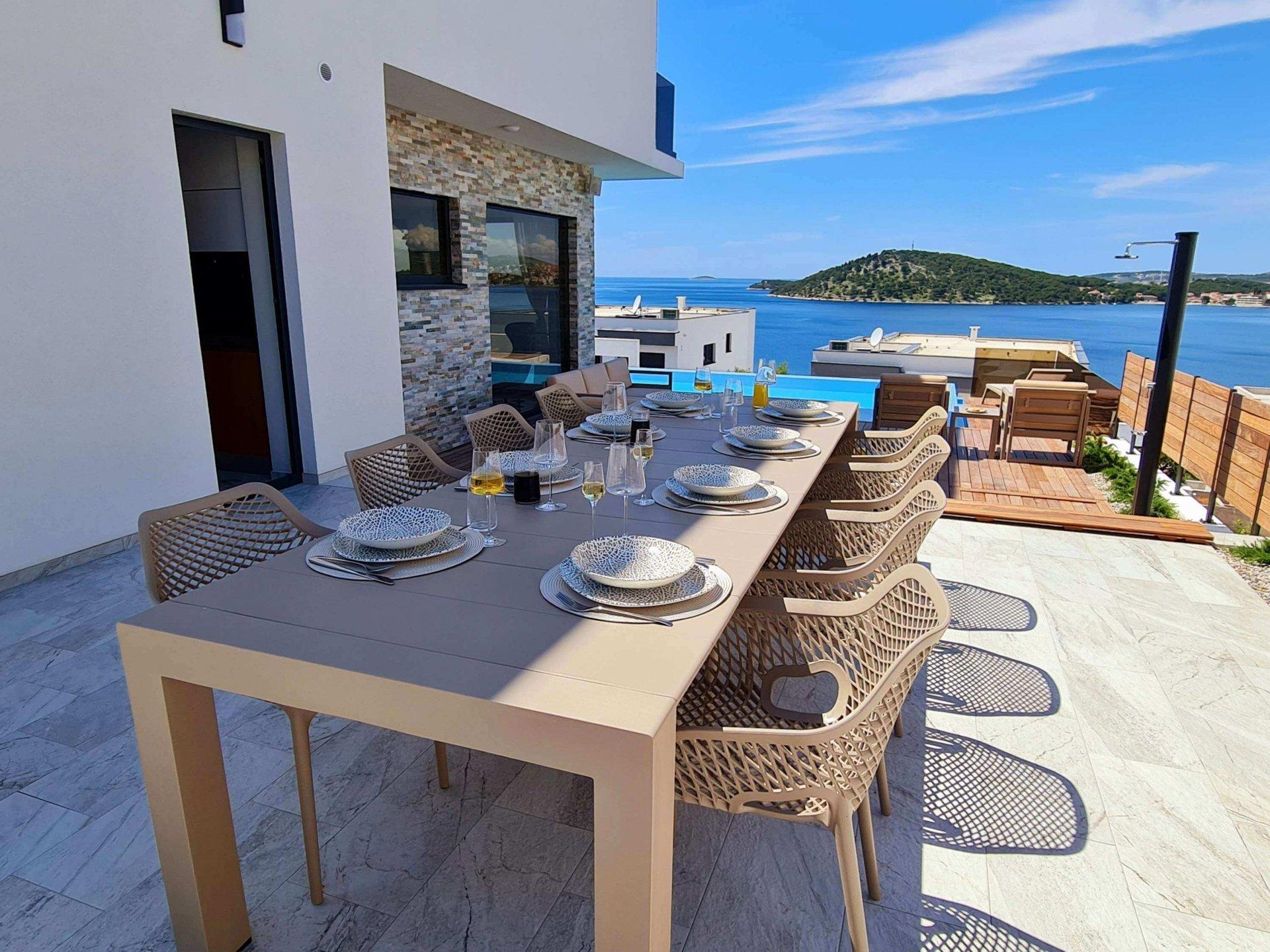 Uvnitř oploceného dvora se nachází zahrada obohacená středomořskými rostlinami a parkoviště pro tři auta. Vila se vyznačuje moderním exteriérem a čistými liniemi, a zároveň maximální funkčností a komfortem prostoru.