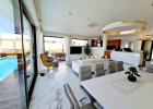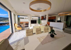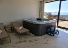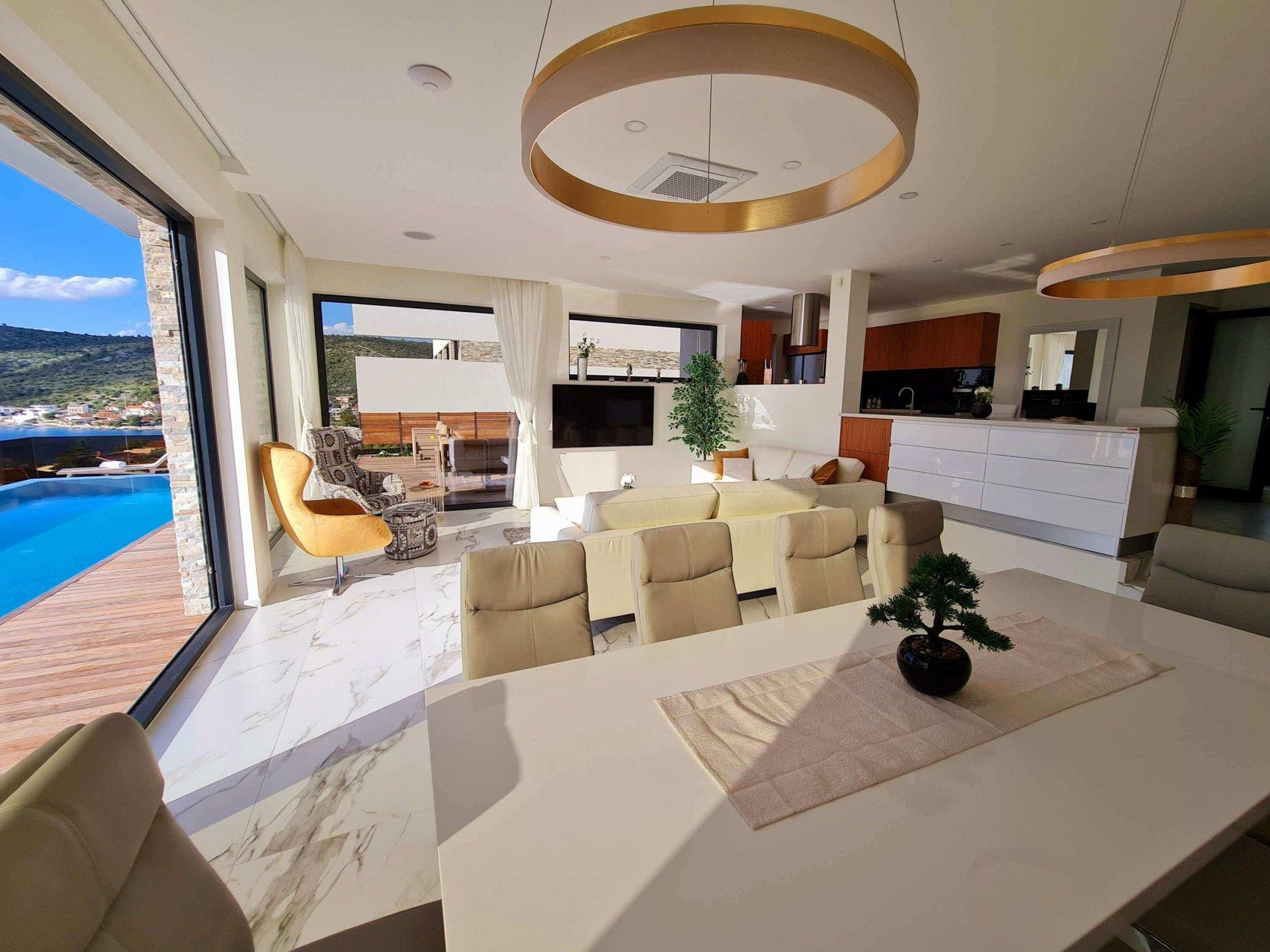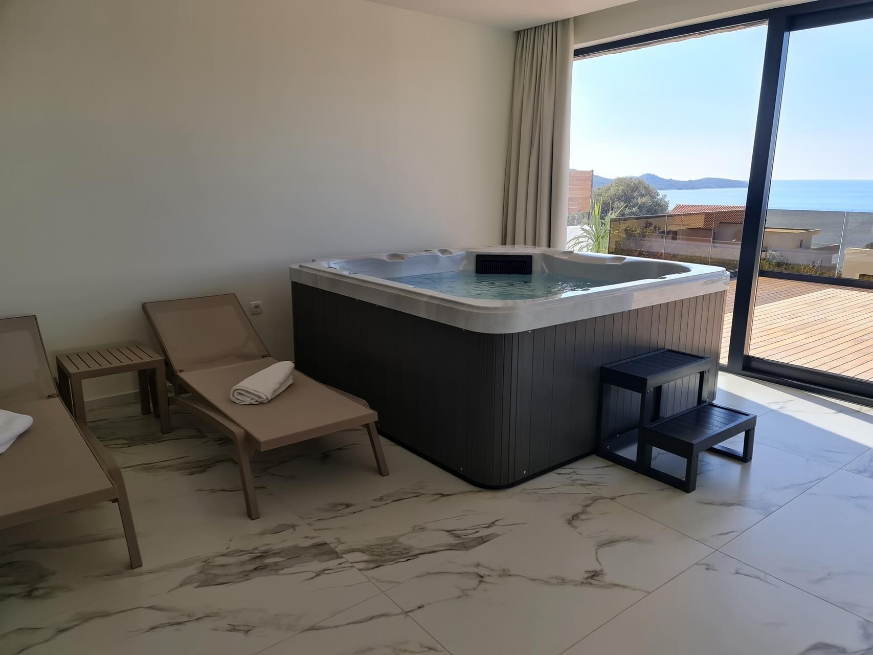 V přízemí se nachází plně vybavená kuchyň, jídelna a obývací pokoj s přístupem na terasu (obloženou teakovým dřevem). Na terase se nachází vyhřívaný bazén. Dále se v přízemí se nachází také wellness/posilovna se saunou a vířivkou, koupelna, toaleta s prádelnou a technická místnost.