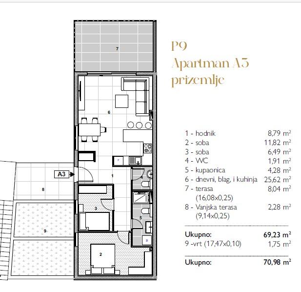 Skládá se ze vstupní chodby, moderní kuchyně s jídelnou a obývacího pokoje se vstupem na terasu, 3 prostorných ložnic, z nichž jedna ložnice má vlastní koupelnu, dále se zde nachází další koupelna a samostatné WC. Výjimečnou atmosféru dodává prostorná střešní terasa s letní kuchyní a vířivkou, ideální pro relaxaci a užívání si výhledu na moře.