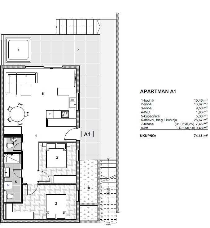 A1, přízemí: 74,43 m² netto, 2 ložnice, terasa, zahrada; Cena: 305 163 €.