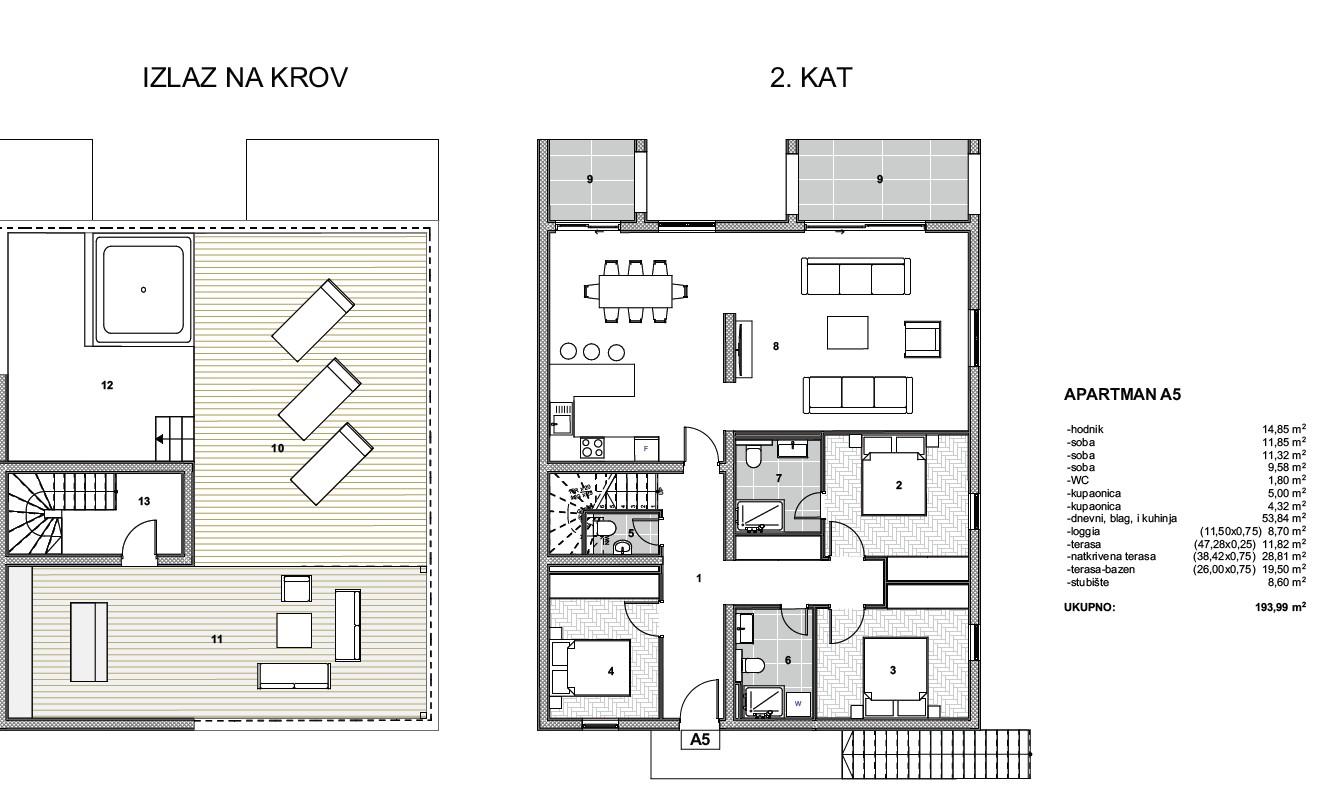 A5, 2. patro: 193,99 m² netto, 3 ložnice, lodžie, střešní terasa, bazén; Cena: 650 000 €.