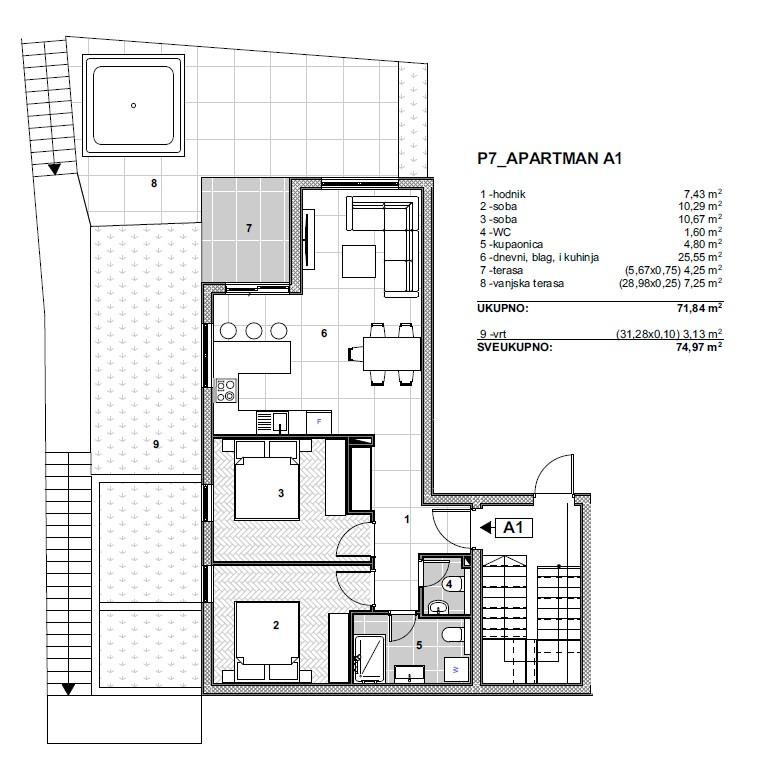 A1, přízemí: 74,97 m² netto, 2 ložnice, zahrada, nábytek v ceně. Cena: 284 886 €.